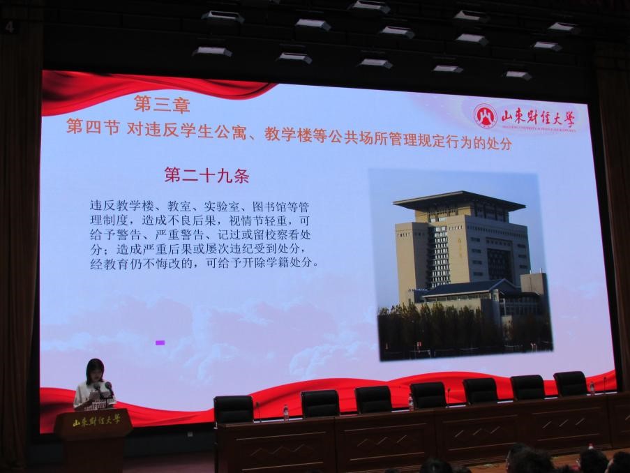 主讲人介绍了《必赢线路检测中心学生违纪处分条例》中总则、处分的种类与适用范围、违纪行为与处分、处分权限和程序、附则五个部分。并结合案例详细解读了学校的相关规定、校园秩序准则、公寓管理条例、学习学术规范等内容。
